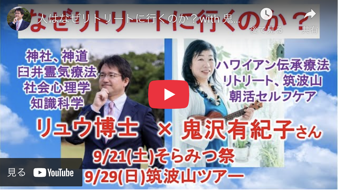 リトリート2026.02.04YouTube出演! 人はなぜリトリートに行くのか? ポスト シェア はてブ 送る Pocket 神社、神道、臼井霊気療法、社会心理学、知識科学について詳しいリュウ博士と熱く語り合いました!! リュウ博士の見えない世界の歩き方 (YouTube) どうぞご覧ください!!